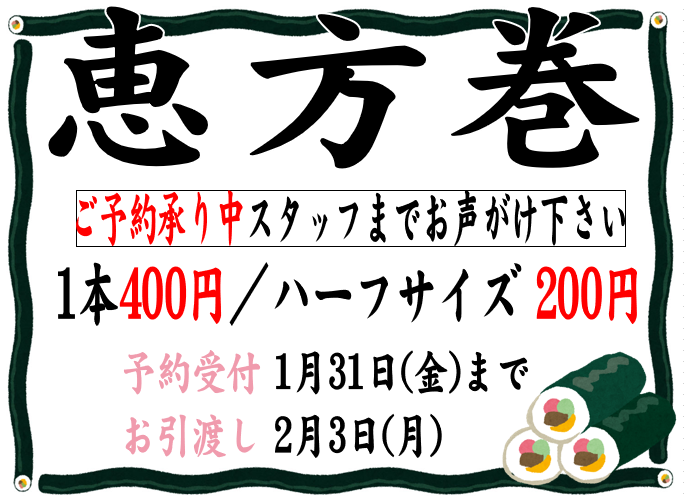毎年ご好評を頂いている恵方巻が今年も登場します。