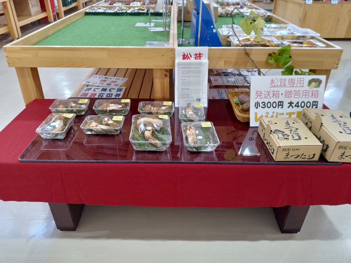当直売所に並ぶ青木村産松茸は採れたての新鮮な品ばかりのため、特に香りが良いと大変ご好評です。