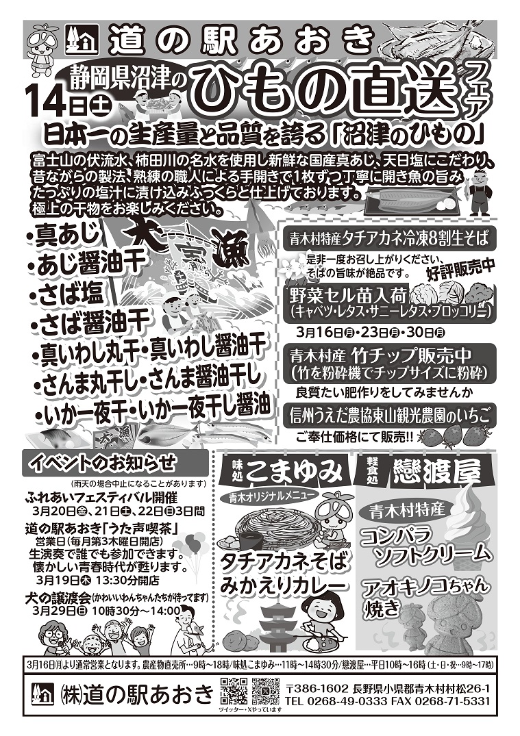 道の駅あおきより各種販売物やイベント、冬季営業時間終了のご案内をいたします。