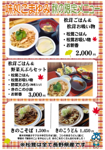 令和7年10月8日(水)より 味処こまゆみ 松茸メニュー・きのこそば・きのこうどん 開始のご案内