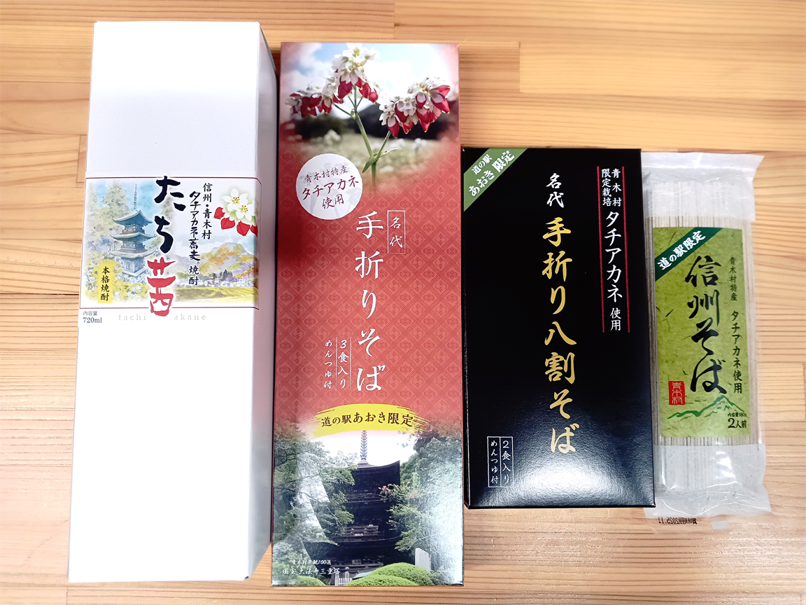 タチアカネを使った焼酎・乾そば・バウムクーヘンなども販売中。